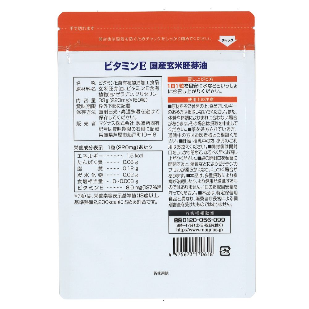 | 原材料 | 玄米胚芽油(国内製造)、ビタミンE含有植物油/ゼラチン、グリセリン |